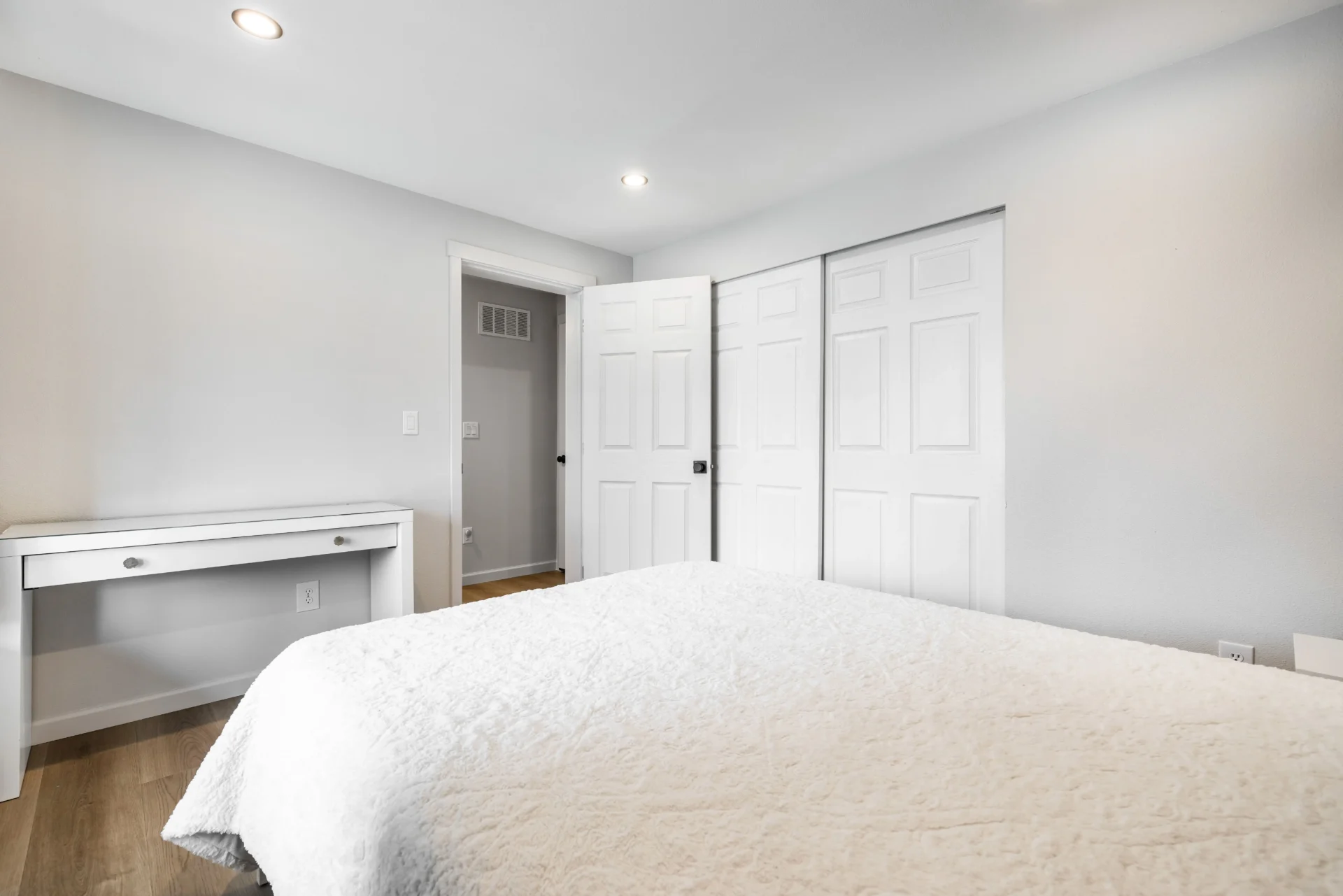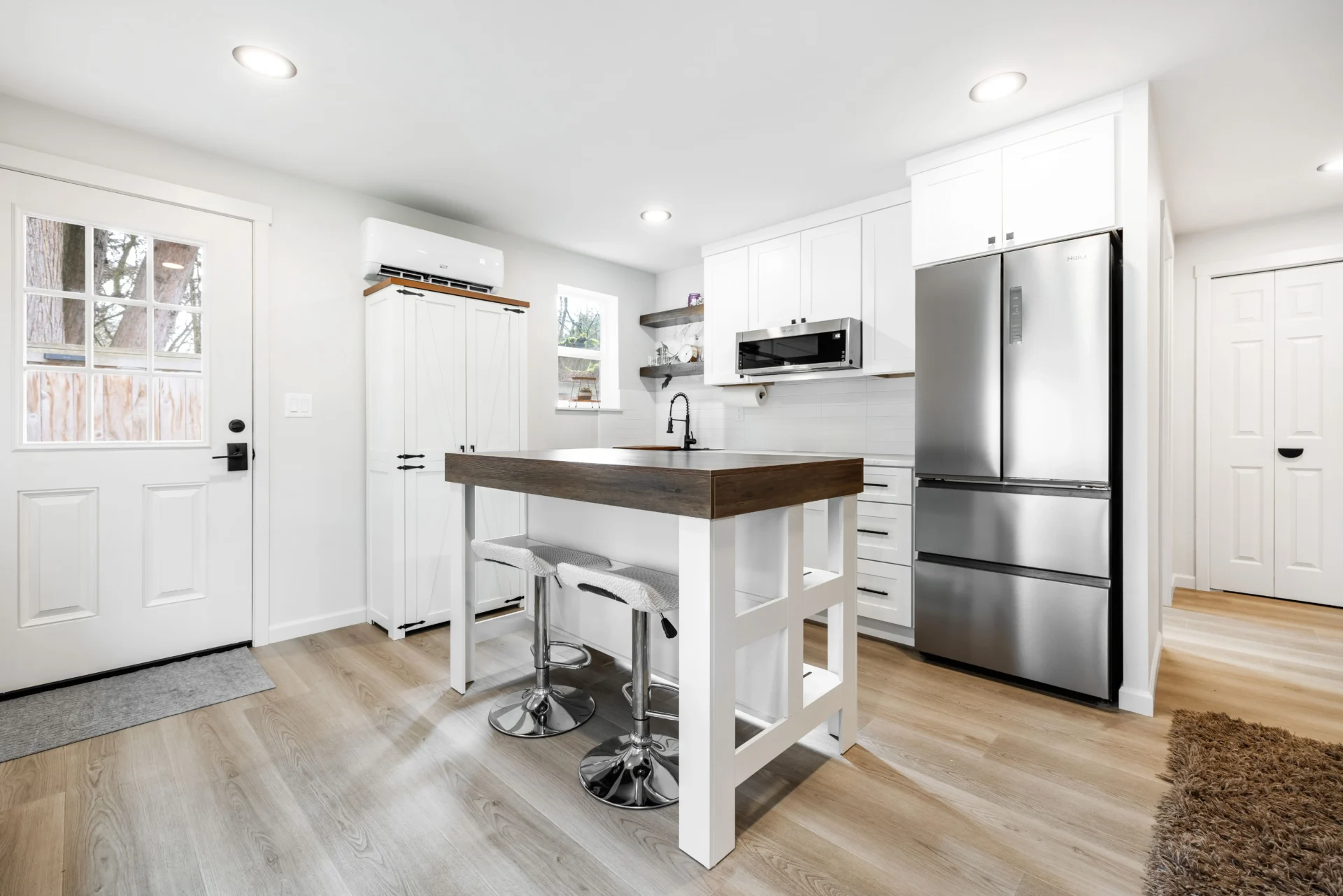 We converted the garage into a modern ADU, adding a full kitchen, a bathroom with shower, and creating a private bedroom with a separate entrance. The layout was redesigned for better flow and privacy by closing off the original access.
