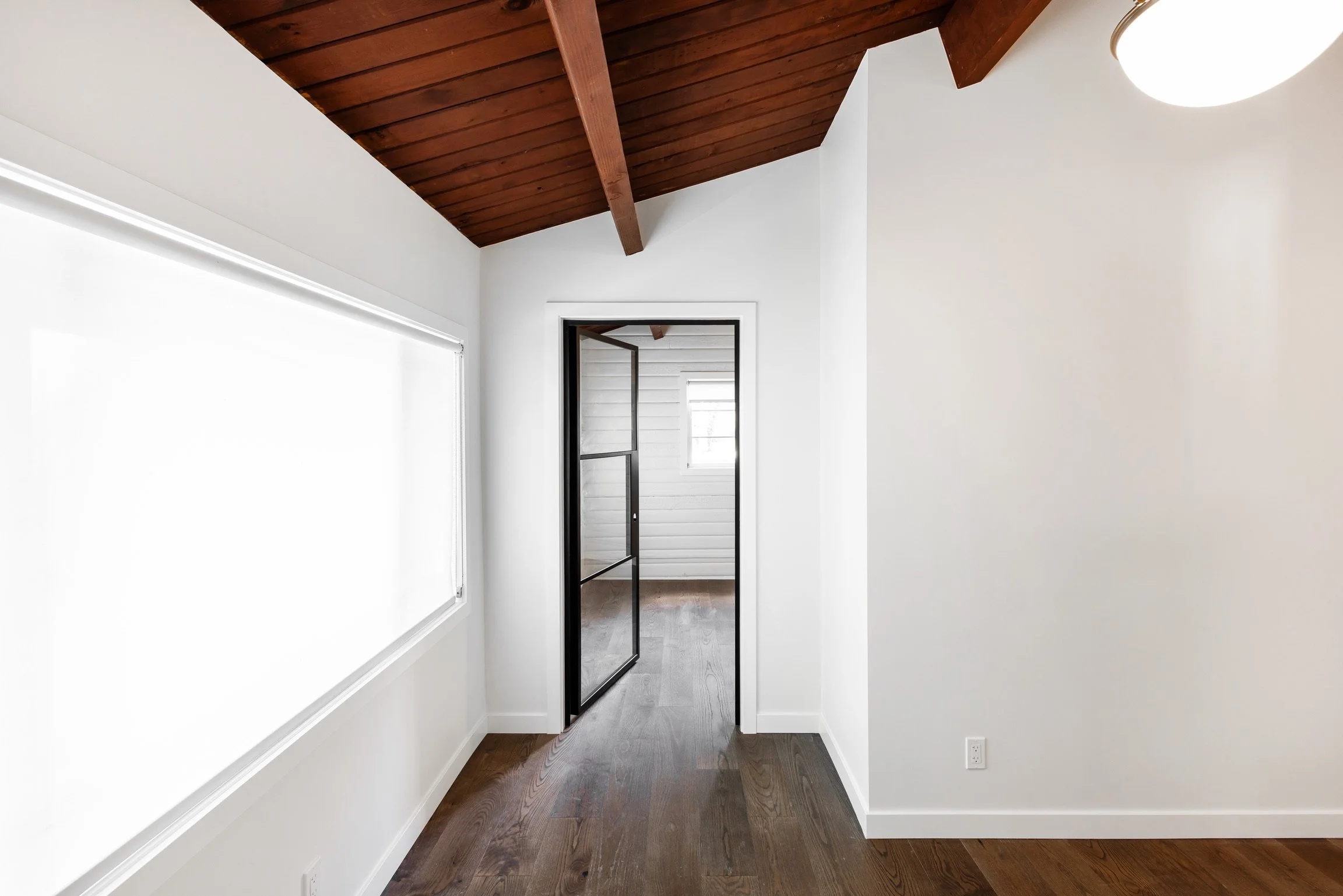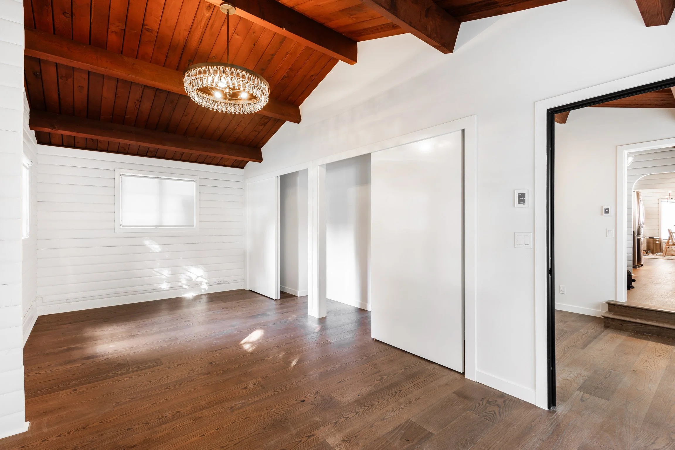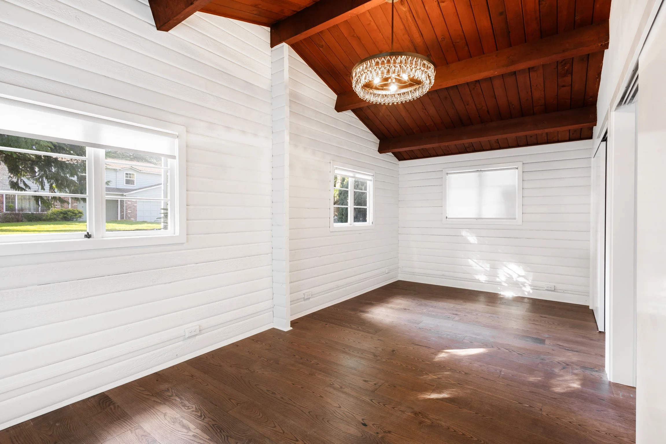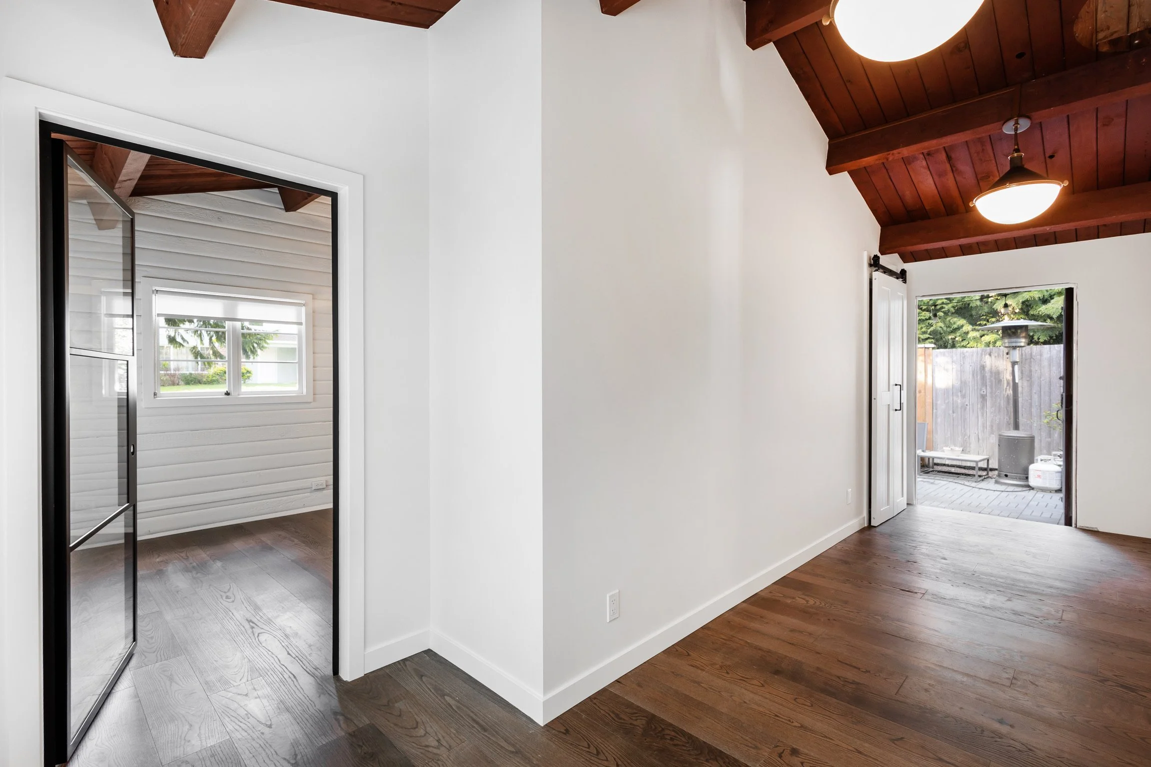 Seamless Interior Flow: We converted a 107 sq. ft. non-functional garage area into a new living room that was directly integrated into an existing bedroom, creating a single, cohesive living flow within the original 1979 house design.